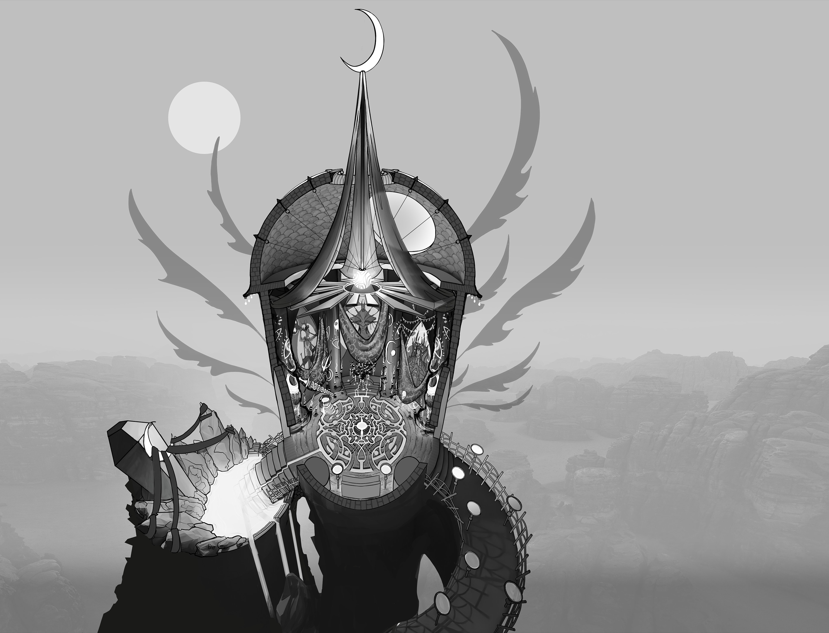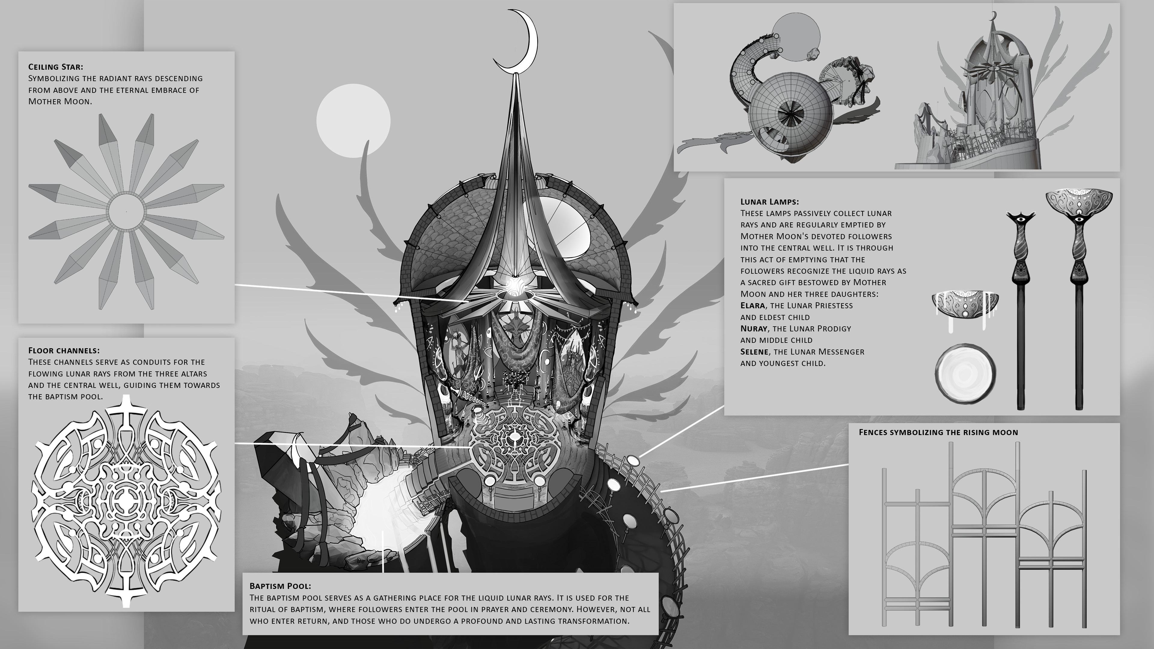 Part 2 of the Constellation project. This depicts the lunar temple where Mother Moon and her three daughters are worshipped. Further exploration of the world building and lore is explained within the images.