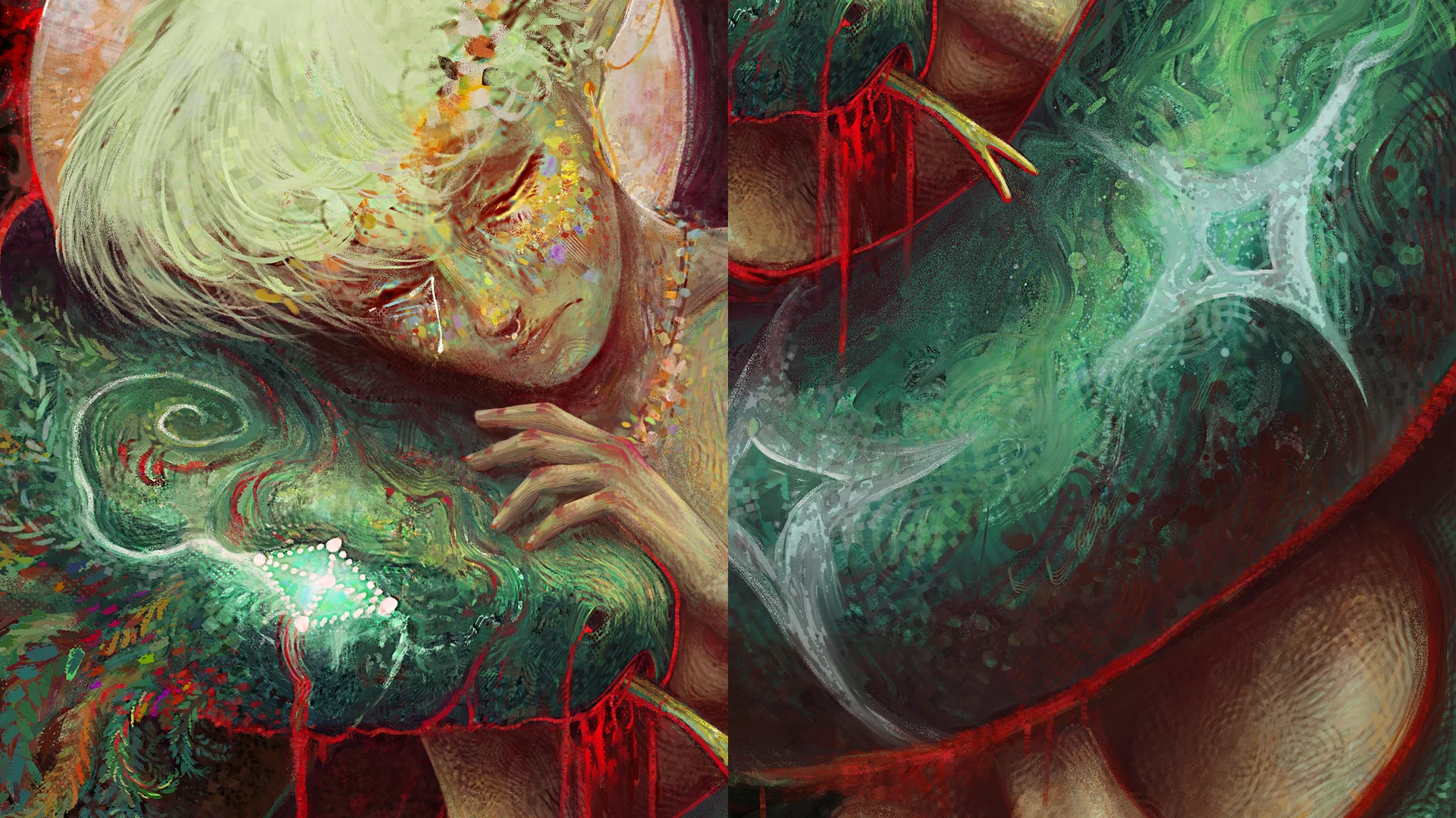 The snake coils around her, constricting her, as she seeks comfort. The star symbols on its scales are painted in chalk, and its mouth is dripping with blood. I have a story in mind, but prefer to keep things open to welcome your own interpretation: who is protecting who?